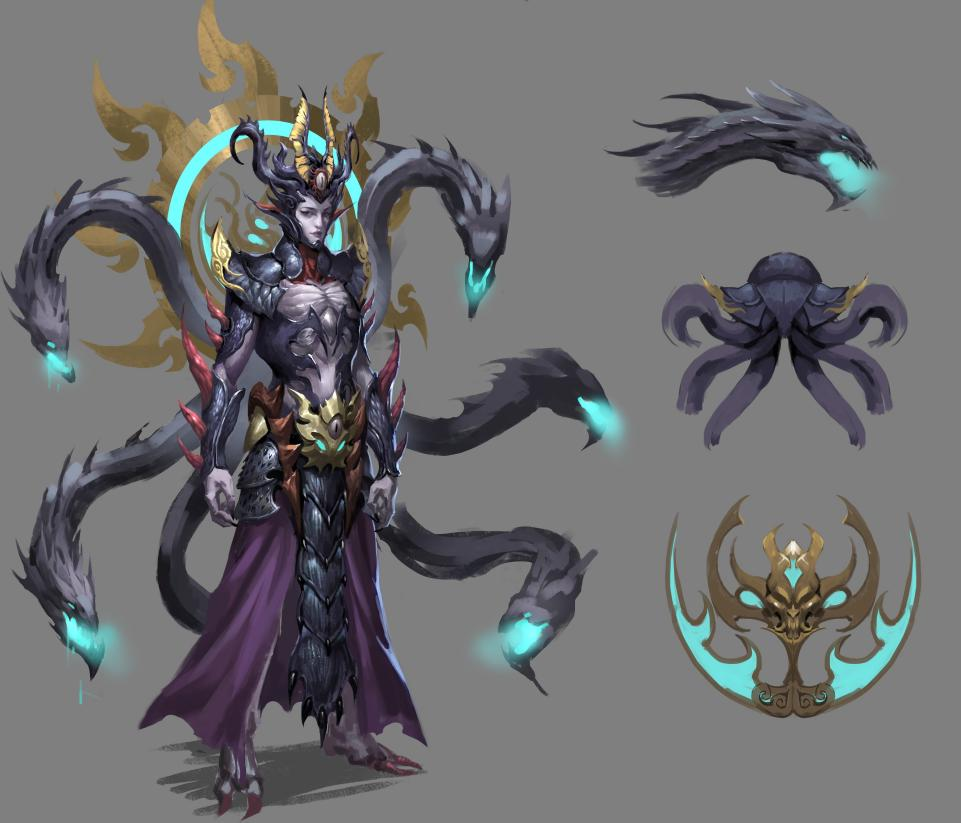 相柳蛇身九头,食人无数,所到之处,尽成泽国。身穿玄黑龙甲,身后九只蛇头吞吐绿色毒瘴。