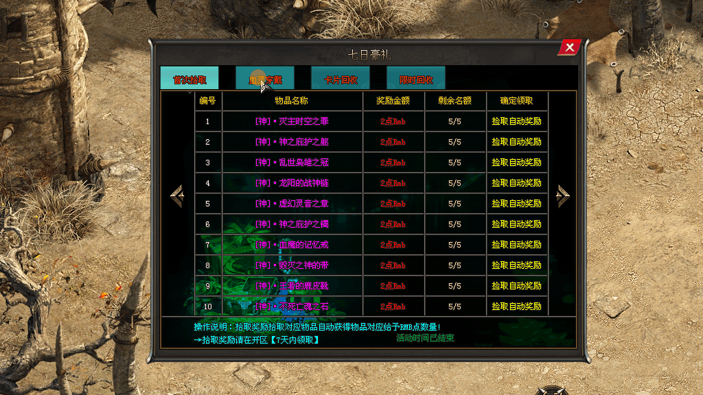 6)七日豪礼:首次拾取,血灵穿戴,永久回收,卡片回收请在开区7天内领取,水浒卡片回收大量RMB点,永久开放回收,每日分享手游礼包也可白嫖20元段位额度。